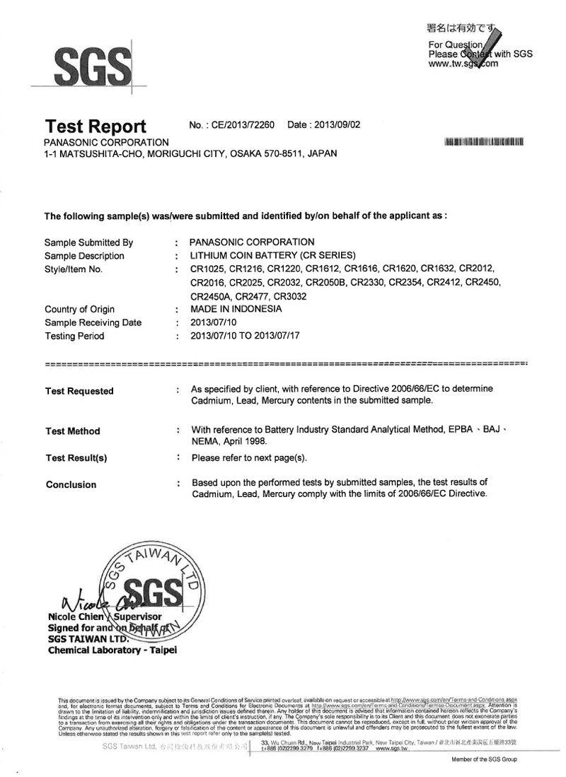 • Panasonic/松下: BR系列扣式鋰電池 CR系列扣式鋰電池 耐高溫BR“A”系列扣式電池 耐高溫CR“AB”系列扣式電池 CR系列圓筒形鯉電池(標準型) LR系列圓筒形干電池